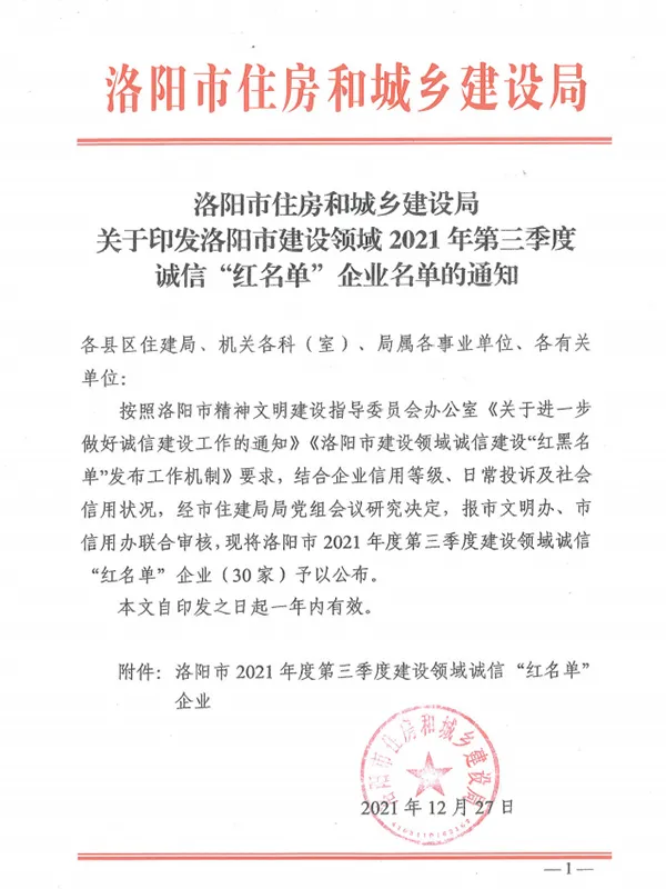 我公司被评为洛阳市2021年度第三季度“建设领域诚信‘红名单’企业