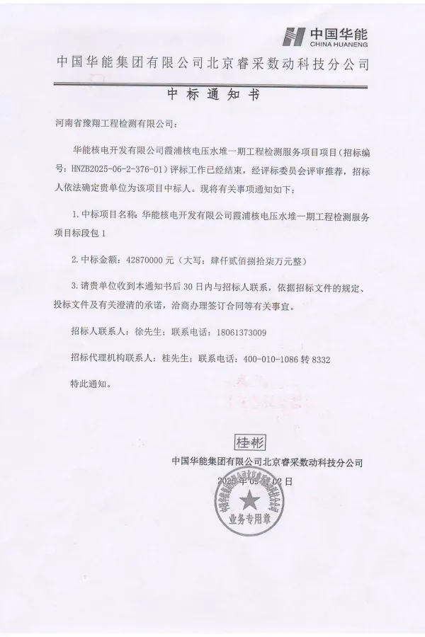 赢博平台在华能核电开发有限公司霞浦核电压水堆一期工程检测服务项目项目(招标编号:HNZB2025-06-2-376-01)评标工作已经结束,经评标委员会评审推荐,依法确定为该项目中标人。